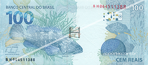 | REVERSO: | A garoupa (Epinephelus marginatus) como figura principal; as expressões "CEM REAIS" e "BANCO CENTRAL DO BRASIL", o número "100"; o quebra-cabeça; as microchancelas e a dupla numeração da cédula, uma localizada no canto inferior esquerdo e a outra, fluorescente, no canto superior direito. | |||