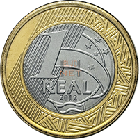 | REVERSO: | À esquerda, linhas diagonais de fundo dando destaque à inscricao indicativa de valor 1, localizada no núcleo, que contem, ainda, a legenda "REAL", a legenda correspondente ao ano de cunhagem 2012 e esfera sobreposta por uma faixa de jubilo, que, com a constelaç˜o do Cruzeiro do Sul, faz alusão ao Pavilhão Nacional. O anel externo apresenta a repetição do grafismo indígena marajoara | |||