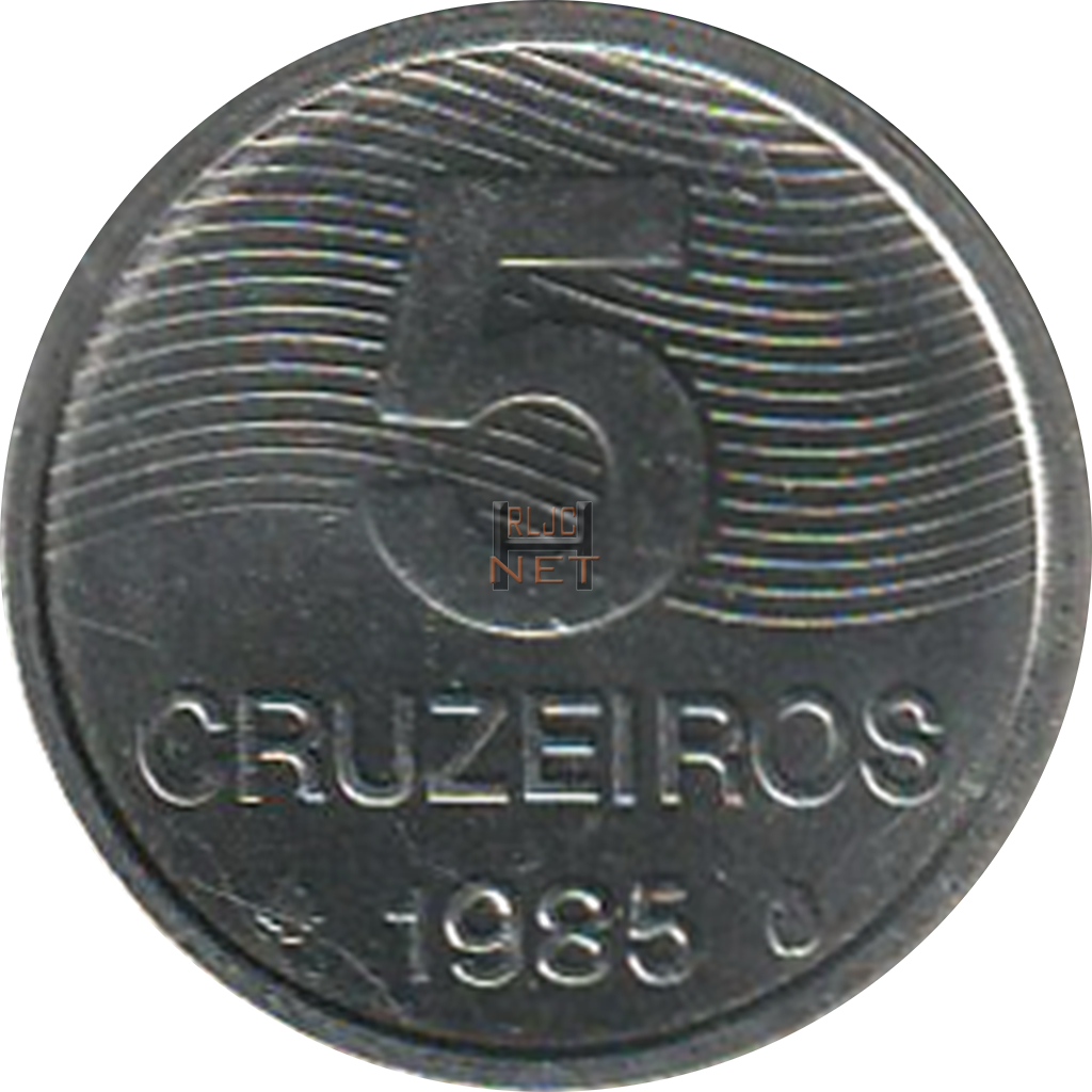 | REVERSO: | Valor 5 cruzeiros e data 1985, sobre fundo de linhas onduladas, ladeada por microcaracteres, à esquerda o símbolo do Banco Central e à direita um zimbo (concha utilizada como moeda no Brasil Colônia) | |||