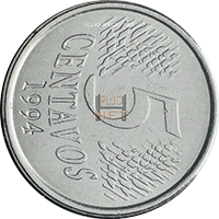 | REVERSO: | Valor 5 centavos, ladeado por ramos de louros. Abaixo, os dísticos "CENTAVOS" e o correspondente ao ano de cunhagem 1994 | |||