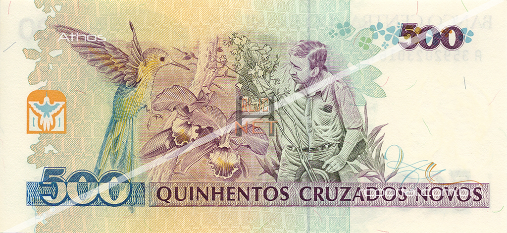 | ANVERSO: | Efígie do cientista Augusto Ruschi (1915-1986), ladeada por alegorias de flora e fauna, destacando-se uma representação da "Cattleya labiata warneri", orquídea que, com dezenas de variedades, é a mais típica do Espírito Santo e a maior flor do gênero no Brasil. | |||