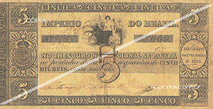 | ANVERSO: | Preto sobre papel branco, em calcografia. À direita, referência ao decreto de 1º de junho de 1833; à esquerda, as Armas do Império; no centro, na parte superior, vinheta com alegoria do Comércio. Espaço para inscrição manuscrita do número e valor 5$000. Nos quatro cantos da moldura o valor 5; acima e abaixo, a legenda CINCO 5, com o "5" na horizontal. Na extremidade esquerda, vinheta de corte (segurança). | |||