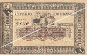| ANVERSO: | Preto e vinho sobre papel branco, em calcografia. Nos ângulos superior esquerdo e inferior direito, efígies de D. Pedro II; Nos ângulos superior direito e inferior esquerdo, as Armas do Império; no centro, na parte superior, vinheta com a alegoria da Justiça, intercalando a legenda IMPERIO DO BRASIL. Valor 200$000 e número de série impressos; número carimbado. Molduras com o valor 200 acima, repetido duas vezes, e escrito por extenso, DUZENTOS, abaixo; Nas laterais, o valor 200 (grande). Na extremidade esquerda, vinheta de corte (segurança). | |||